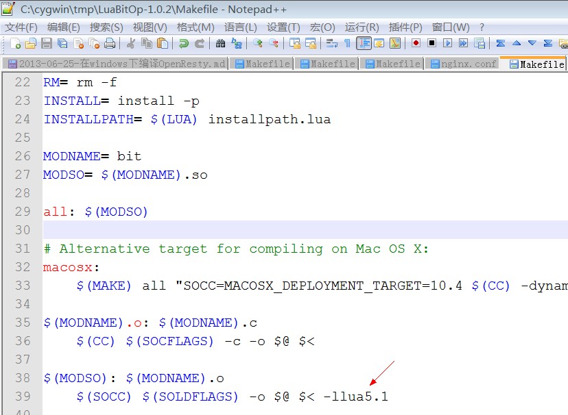 打开 C:\cygwin\tmp\ngx_openresty-1.2.8.6\bundle\lua-cjson-1.0.3\Makefile, 加入 -llua5.1