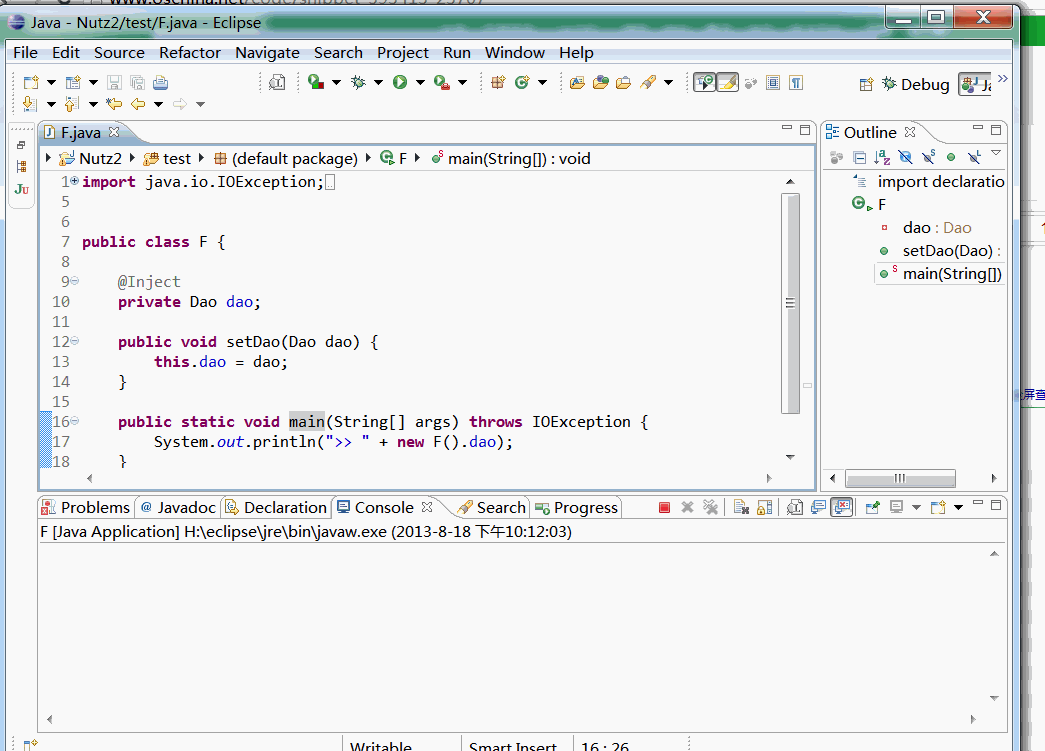 运行即可看到, 变量dao为null,但为什么呢? 已经加了@Inject注解了啊